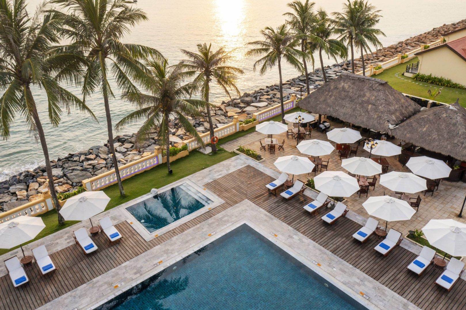 在维多利亚会安海滩水疗度假村的景观泳池中放鬆自己,同時欣赏美妙的天际线景…