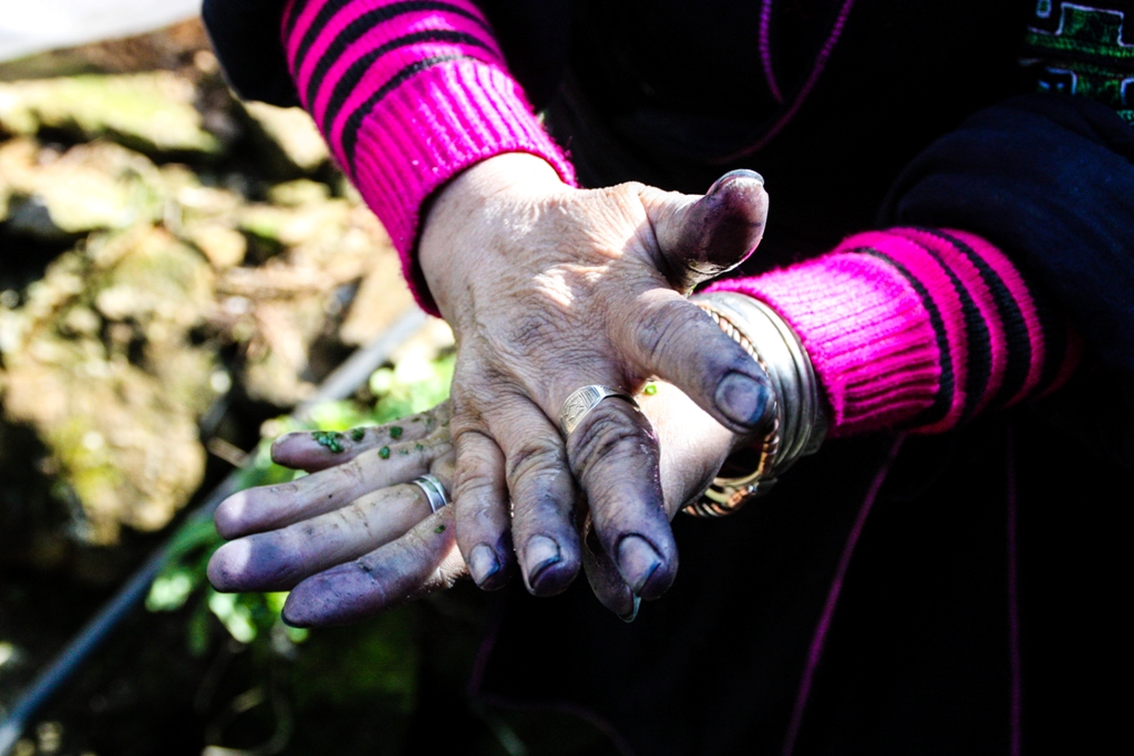 One of the joys of exploring Sapa is learning to differentiate between the ethnic groups based on their dress. For the Black Hmong, look for a base of deep blueish-purple fabric, the result of hemp linen dyed with indigo, often grown right in the villages. Some of the women will often have telltale stained hands, a sure sign of the strong arts and crafts culture of the Hmong people.