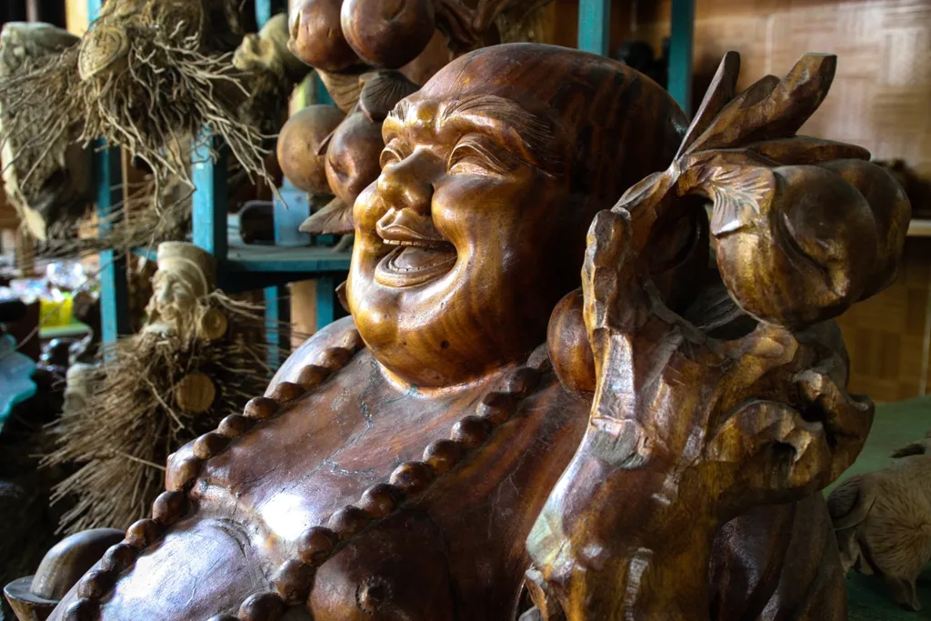 At the carpentry village of Kim Bong, 25 year-old Uyen sits with a wooden Buddha statue wedged between his feet.