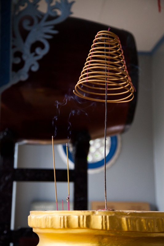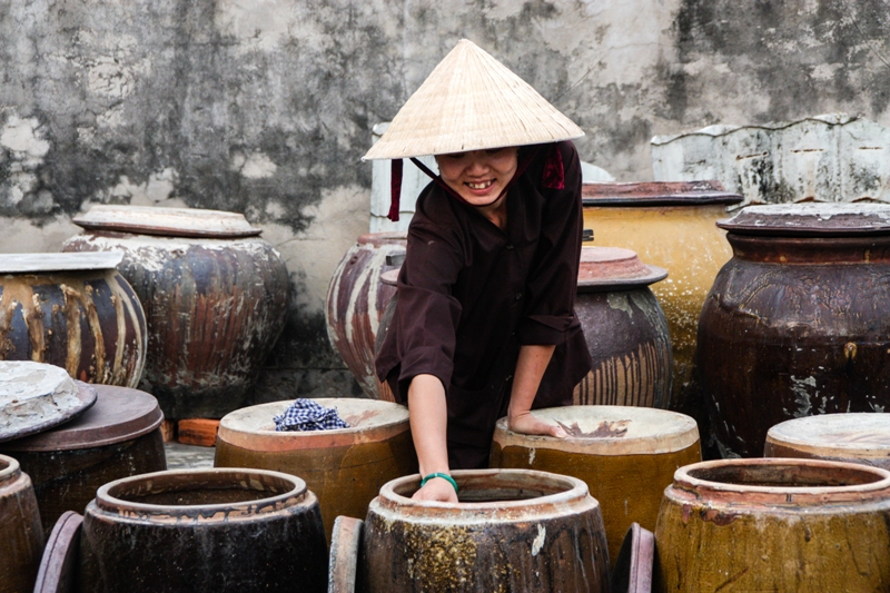 We find ourselves in a small factory of sorts, making vegetarian condiments like soy sauce and fermented tofu to both supplement the strictly vegetarian Buddhist diet and as a source of supplementary income for the pagoda. Huong, a mirthful Buddhist nun with a ready smile and lightning-fast commentary (all in Vietnamese, mind you) shows us around, first to where the soya beans are soaked.