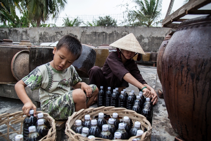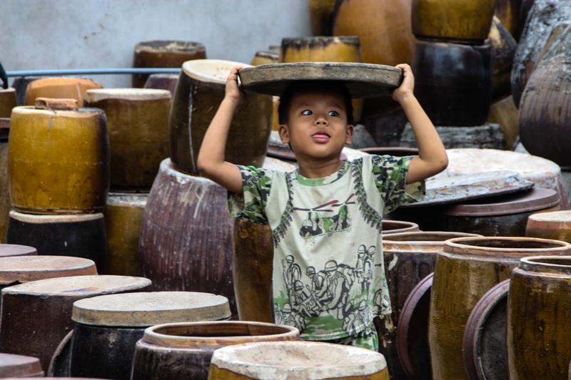 A particularly cheeky little boy, the son of the one of the local women, helps by taking the lids off the vats on sunny days and covering them on wet days. Today, he’s thrilled to be the center of attention and gleefully makes a show out of his work.