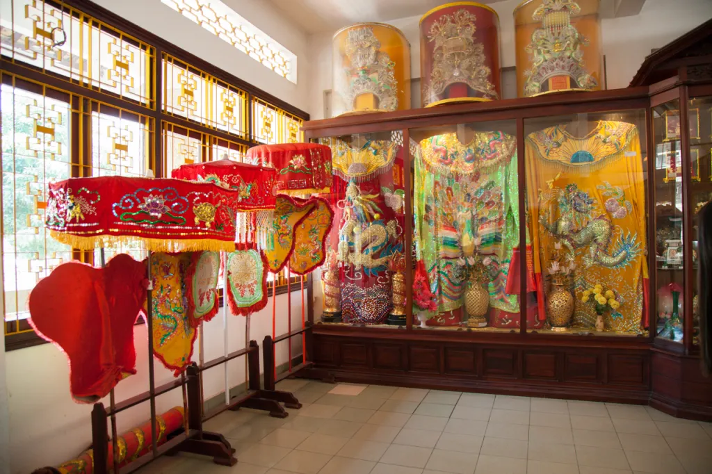 Stacks of rice and other gifts line the inner area of the lotus-shaped temple, in addition to a showroom of colorful sequined robes and ornate headdresses used as part of the annual ceremony which includes bathing and re-dressing the statue. Plaques and gifts also fill the room, donated by people whose prayers have been answered.