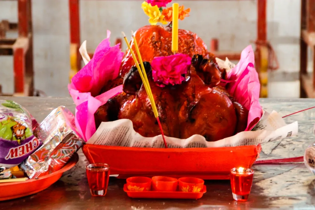 ? The Lady Xu Temple and the Tay An Temple are less than a 10 minute walk apart. Shops line the road between the two selling baskets of fruit, whole roasted pigs and other items. There is even a service for “renting” a roasted pig!