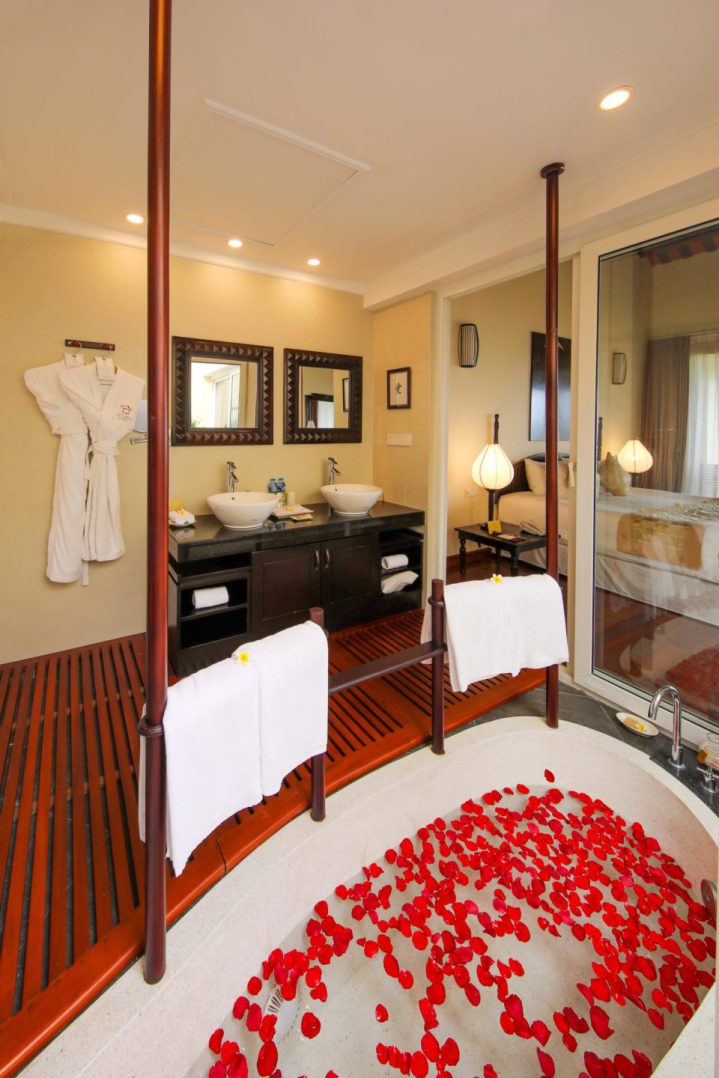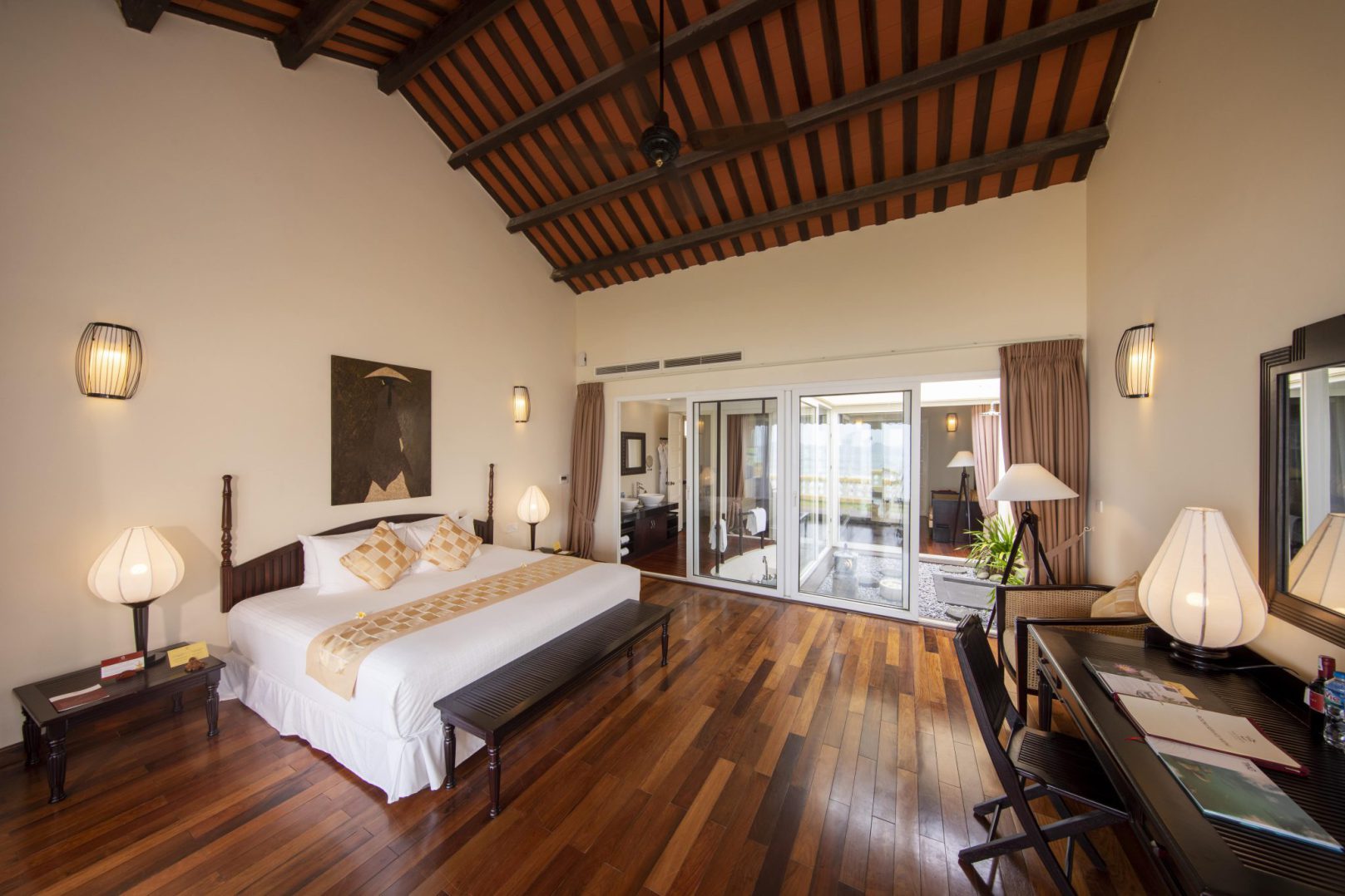 The Deluxe room is designed with high ceilings, creating a warm and cozy ambiance reminiscent of a small fishing village in Hoi An. With a balcony overlooking the lush green garden adorned with small ponds and grassy areas, the Garden View Deluxe room offers an intimate and wonderful experience for guests.