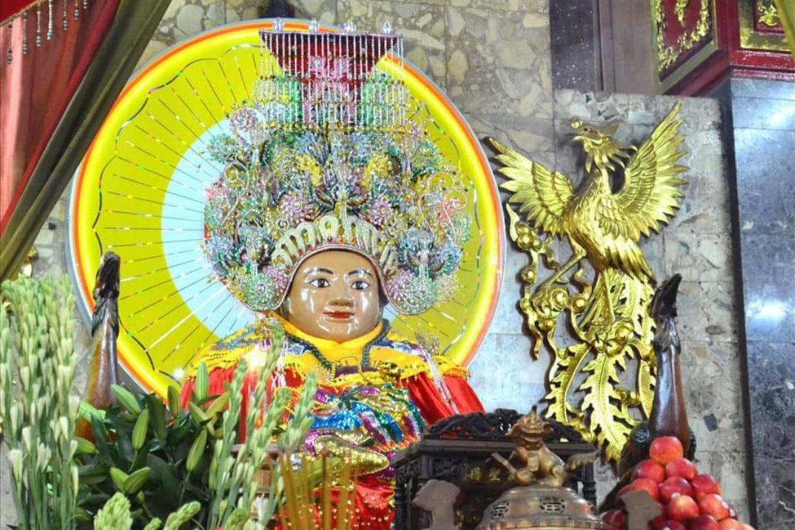 Bên trong chánh điện, tượng Bà được thờ trang trọng trong không gian rực rỡ ánh đèn, khói hương nghi ngút. Pho tượng Bà bằng đá sa thạch ngồi uy nghi trên bệ cao, khoác áo choàng lộng lẫy, đội mão vàng – hình ảnh tôn kính mà bất cứ ai khi bước vào đều cảm nhận được sự linh thiêng, trang nghiêm.