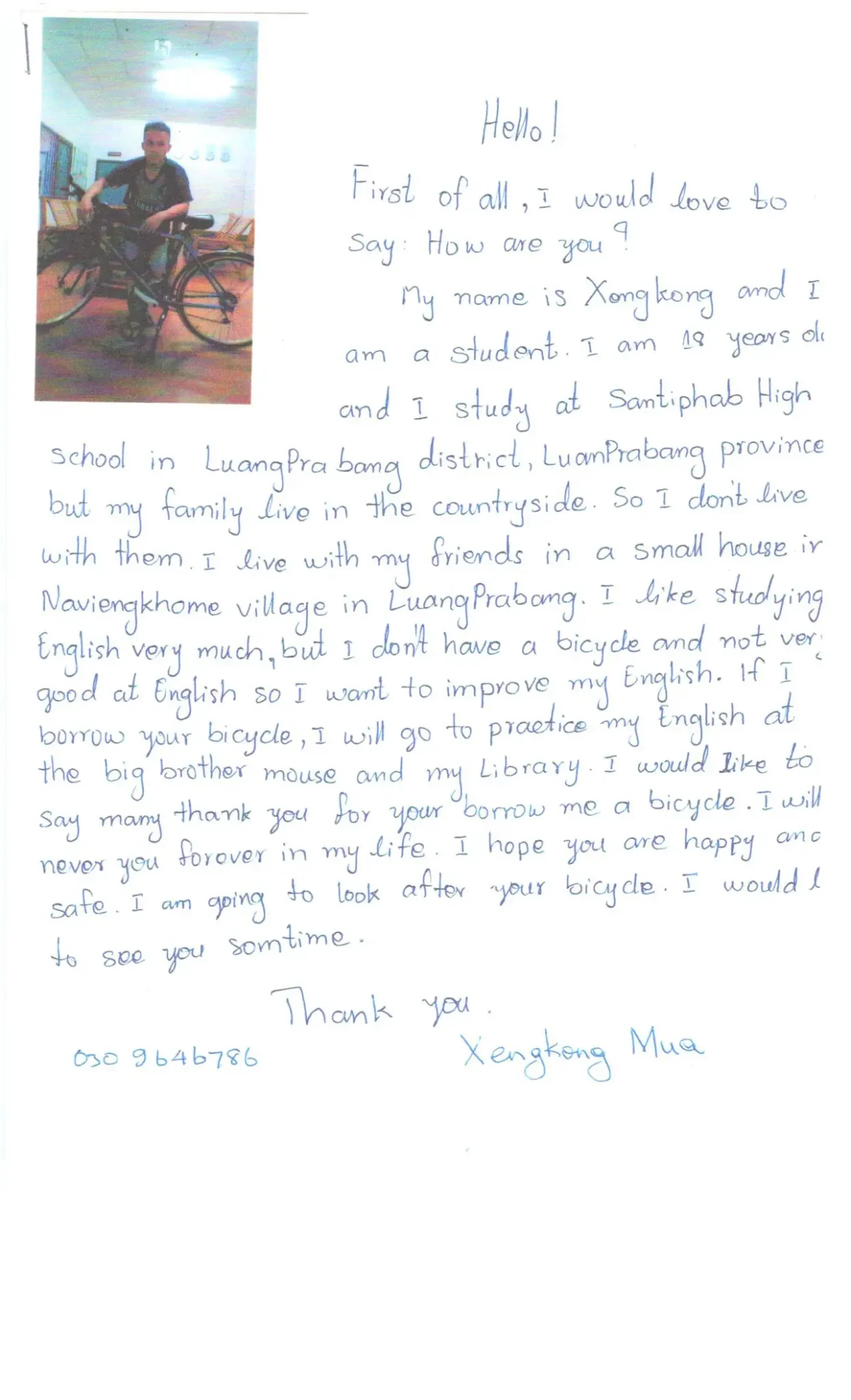 “Xin chào! Trước hết, tôi muốn nói: Bạn có khỏe không? ” Xengkong Mua, 18 tuổi đã viết. “Tôi rất thích học tiếng Anh, nhưng tôi không có xe đạp… Nếu tôi mượn xe đạp của bạn, tôi sẽ đi luyện tiếng Anh ở nhà anh tôi và thư viện… Tôi sẽ không bao giờ [quên] bạn mãi mãi trong cuộc sống của tôi… Tôi sẽ trông nom chiếc xe đạp của bạn. ”