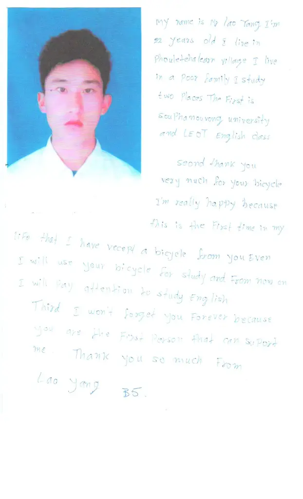 “Tôi tên là Lao Yang. Tôi 22 tuổi… Tôi sống trong một gia đình nghèo. Cảm ơn bạn rất nhiều cho chiếc xe đạp của bạn. Tôi rất hạnh phúc vì đây là lần đầu tiên trong đời tôi được tặng một chiếc xe đạp… Tôi sẽ không quên bạn mãi mãi vì bạn là người đầu tiên có thể hỗ trợ tôi. ”