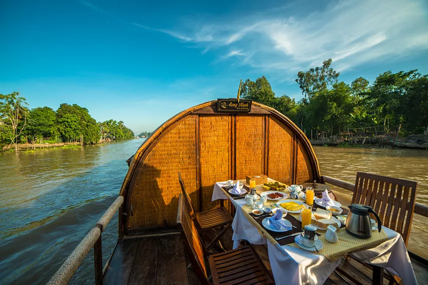 Trải nghiệm vẻ đẹp của đồng bằng sông Cửu Long trên chuyến du thuyền Sông Xanh, hòa mình vào nét quyến rũ mộc mạc của vùng nông thôn với những cánh đồng lúa bạt ngàn và các vườn cây ăn trái nhiệt đới tươi tốt.